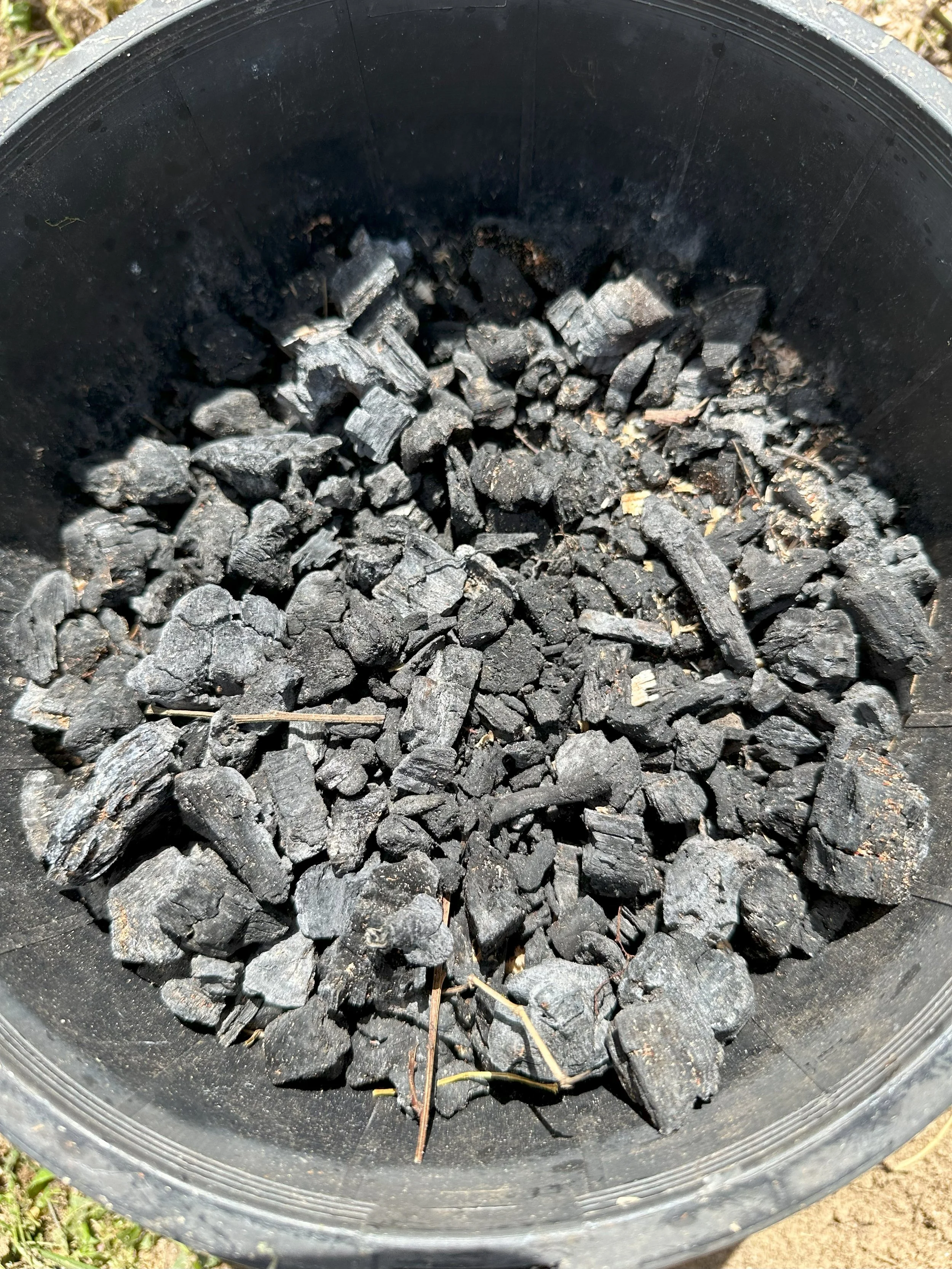 When the collection vessel becomes full of char under the grate you can make more space by pulling the char forward. you can also make more space by removing the biochar using a fork or shovel during the process and placing in a bucket or pot with holes in it.